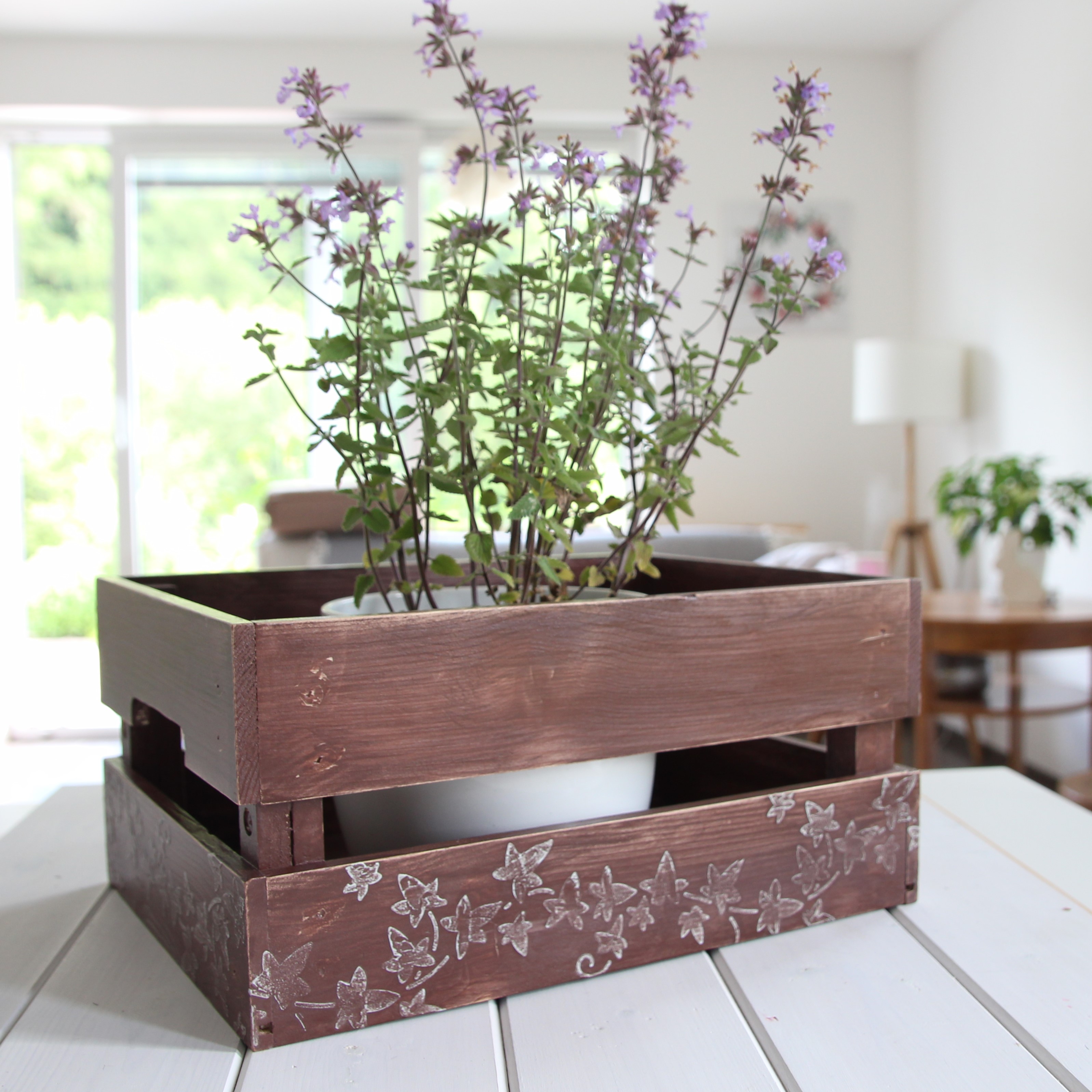 Představuji Vám dřevěnou bedýnku, která skvěle poslouží jako obal na květiny u vchodu do vašeho obydlí. Stane se i bylinkovou zahrádkou, obalem na pokojové květiny, zásobníkem na cokoliv. ;-)