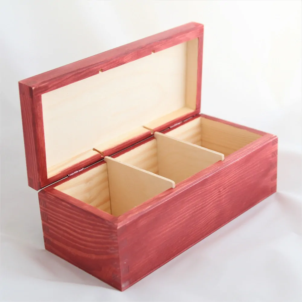 Krabička je dřevěná, celá je namalovaná červenohnědou akrylovou barvou, skrz níž prosvítá výrazná kresba dřeva. Celá krabička je do hladka obroušená, nalakovaná nezávadným matným interiérovým lakem, díky této úpravě lze ji snadno udržovat.