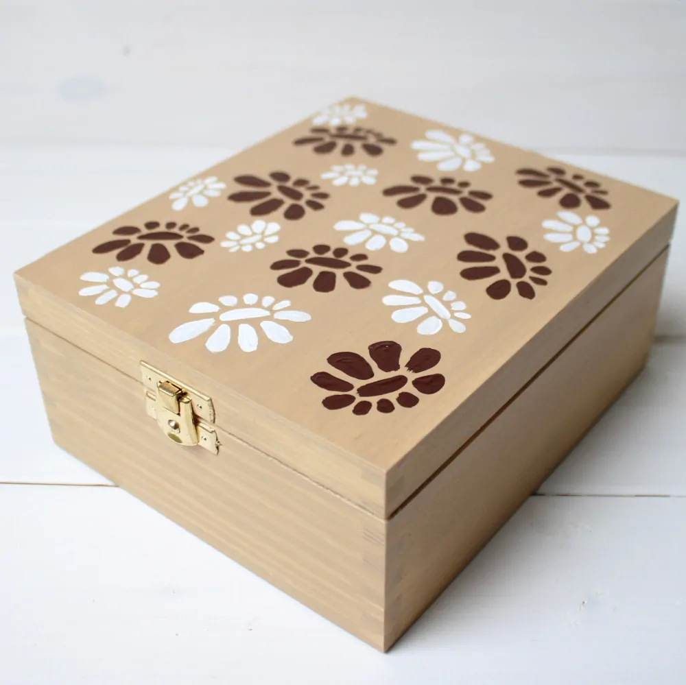 Představuji Vám Hnědou, kytkovanou.. krabičku, která výborně poslouží pro uložení čajových sáčků či osobních pokladů všeho druhu a zároveň bude praktickým bytovým doplňkem. Krabička je dřevěná, celá je namalovaná světlehnědou akrylovou barvou, skrz níž prosvítá výrazná struktura dřeva. Krabička je zdobena ručně malovanými kvítky. Celá krabička je do hladka obroušená, nalakovaná matným interiérovým lakem, díky této úpravě lze ji snadno udržovat.