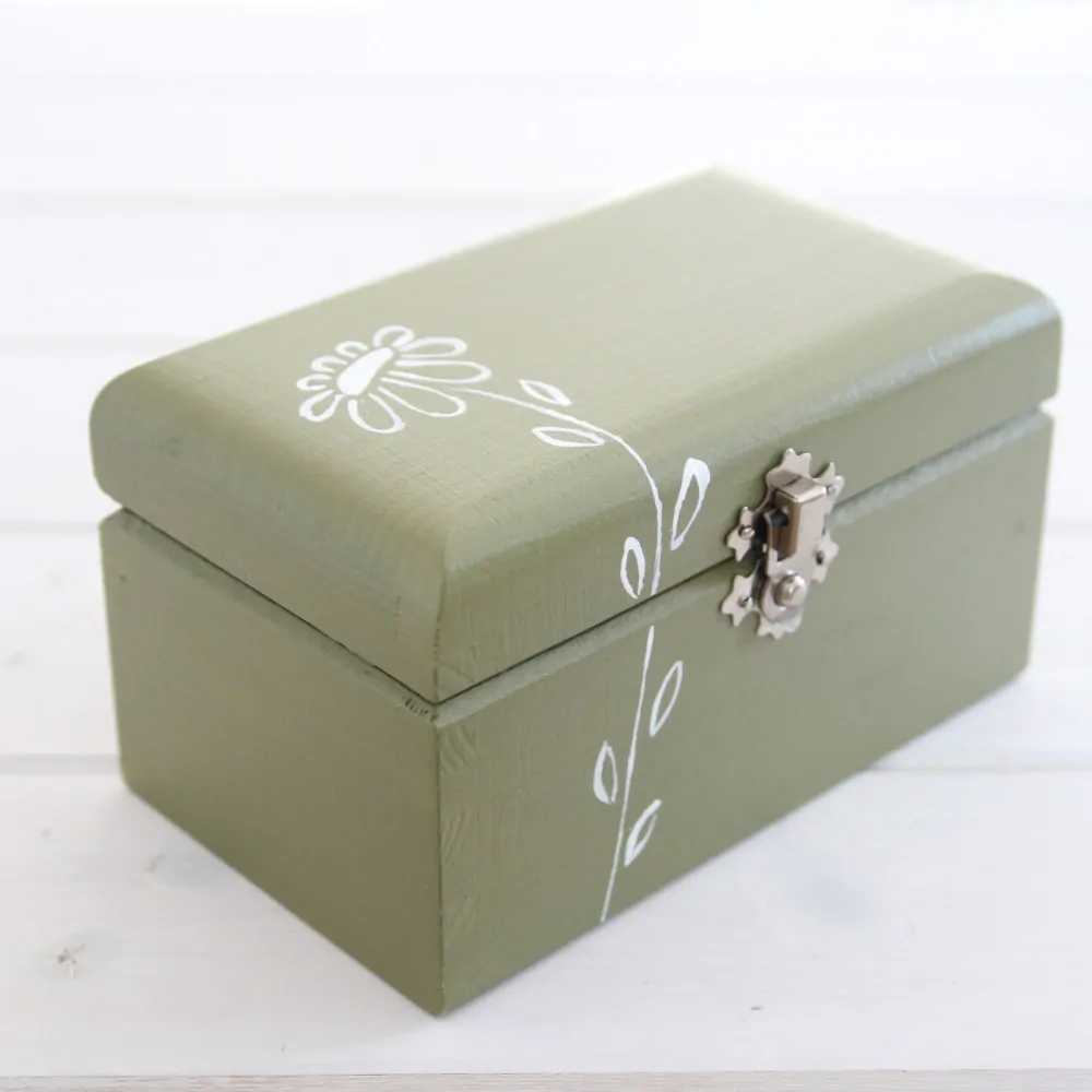 Krabička je dřevěná, má zaoblené hrany na víčku, celá je namalovaná khaki akrylovou barvou pod níž je zřetelná velmi výrazná kresba dřeva. Krabička je ozdobena ručně malovanou kytkou. Celá krabička je do hladka obroušená, nalakovaná nezávadným matným interiérovým lakem, díky této úpravě lze ji snadno udržovat.