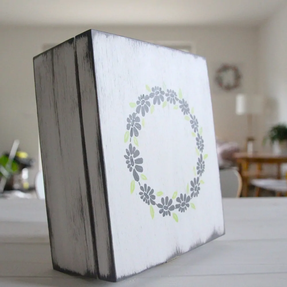 Krabička je dřevěná, celá je namalovaná bílou akrylovou barvou, patinovaná barvou šedou. Na krabičce je patrná výrazná struktura dřeva. Krabička je zdobena ručně malovanými kvítky stočenými do věnečku. Celá krabička je do hladka obroušená, nalakovaná matným interiérovým lakem, díky této úpravě lze ji snadno udržovat.