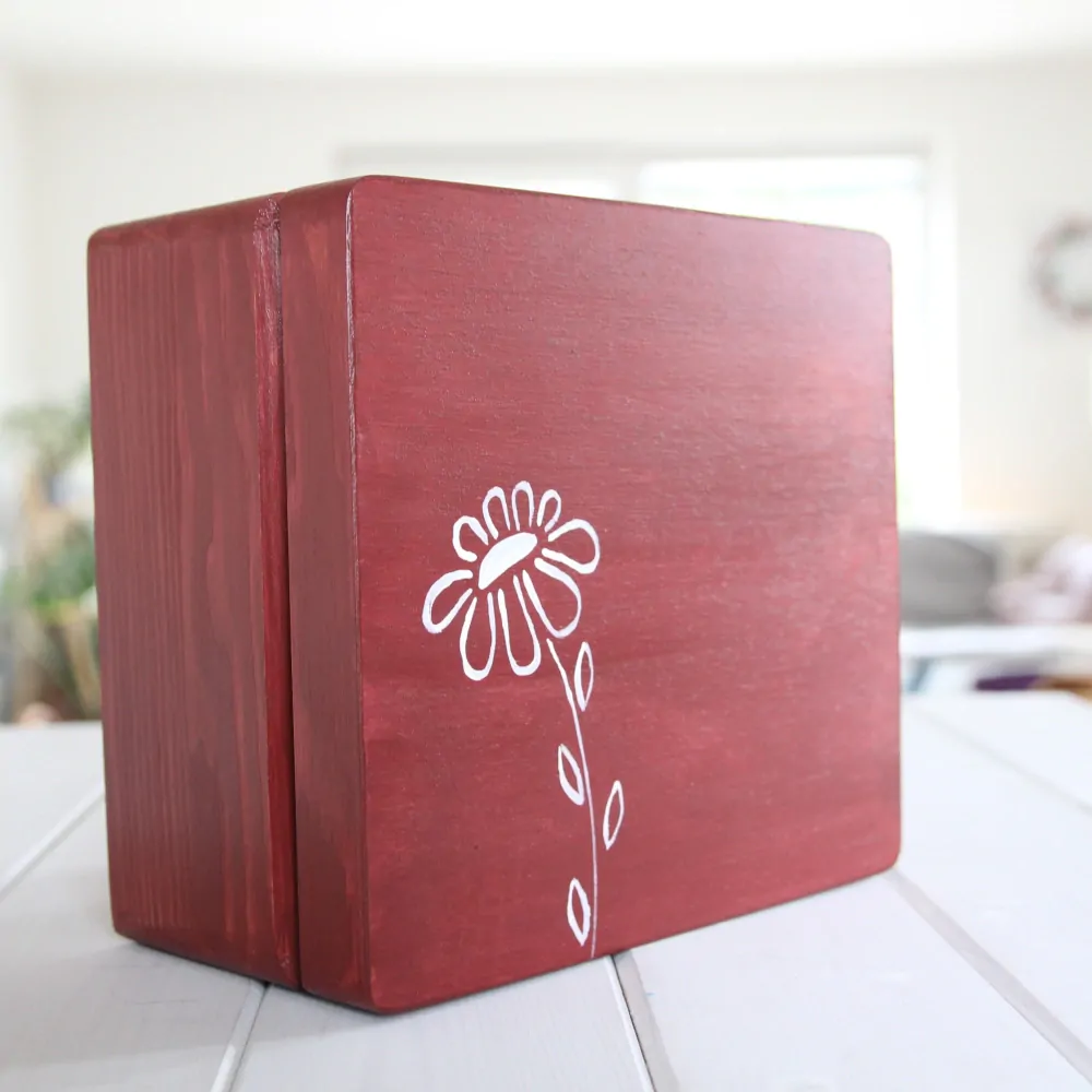 Krabička je dřevěná, skoro čtvercová, se zaoblenými hranami. Celá je namalovaná výraznou akrylovou barvou v červenohnědém odstínu, skrz níž prosvítá výrazná kresba dřeva. Na vrchní straně je zdobena ručně malovanou kytkou Vnitřní prostor je ponechán v přírodním provedení.
