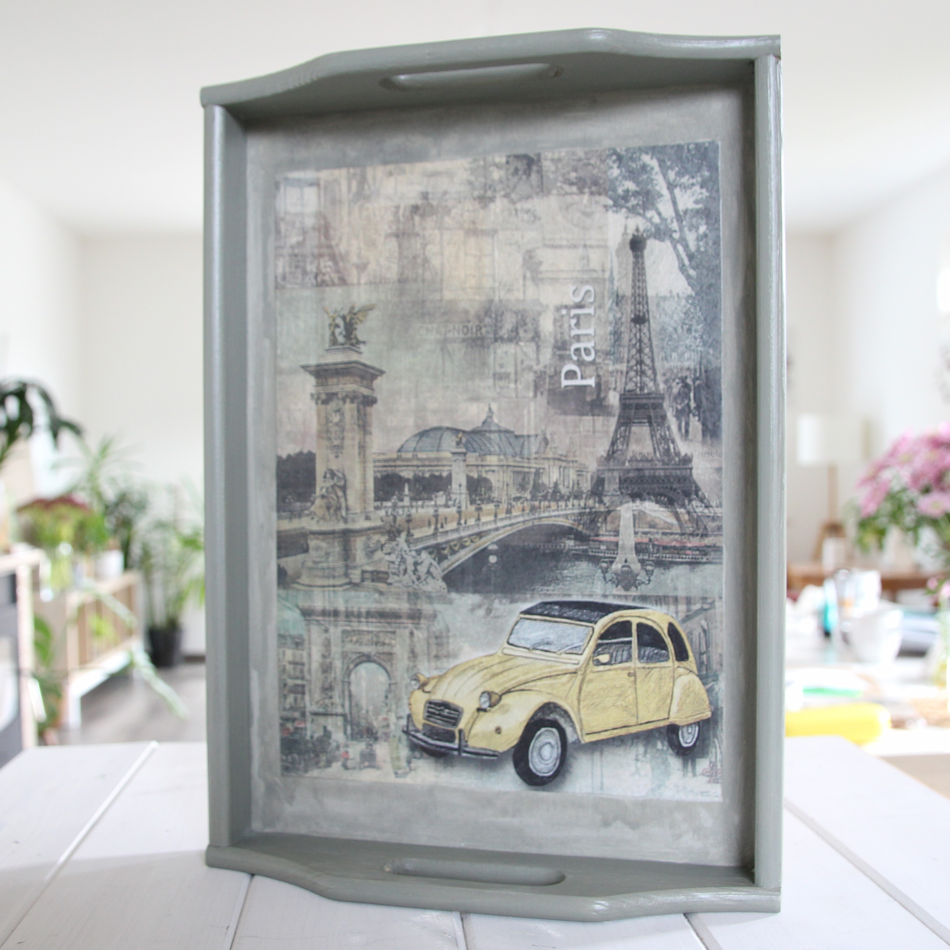 Celý podnos je namalován akrylovou barvou v odstínu khaki, skrz níž prosvítá výrazná kresba dřeva. Dno tácu je zdobeno motivem staré Paříže. Celý podnos je pečlivě nalakovaný několika vrstvami nezávadného interiérového laku, v případě potřeby jej lze otírat vlhkou utěrkou.
